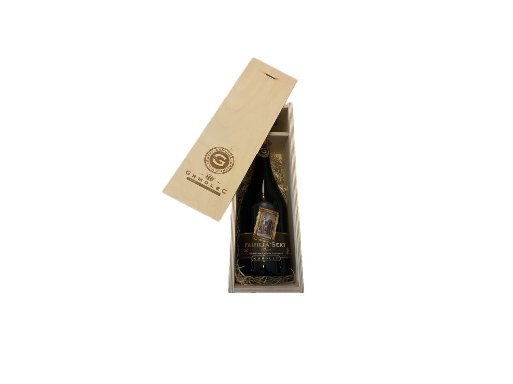 Luxusní dřevěná kazeta na 1 lahev sektu s logem GRMOLEC - rodinné vinařství.
